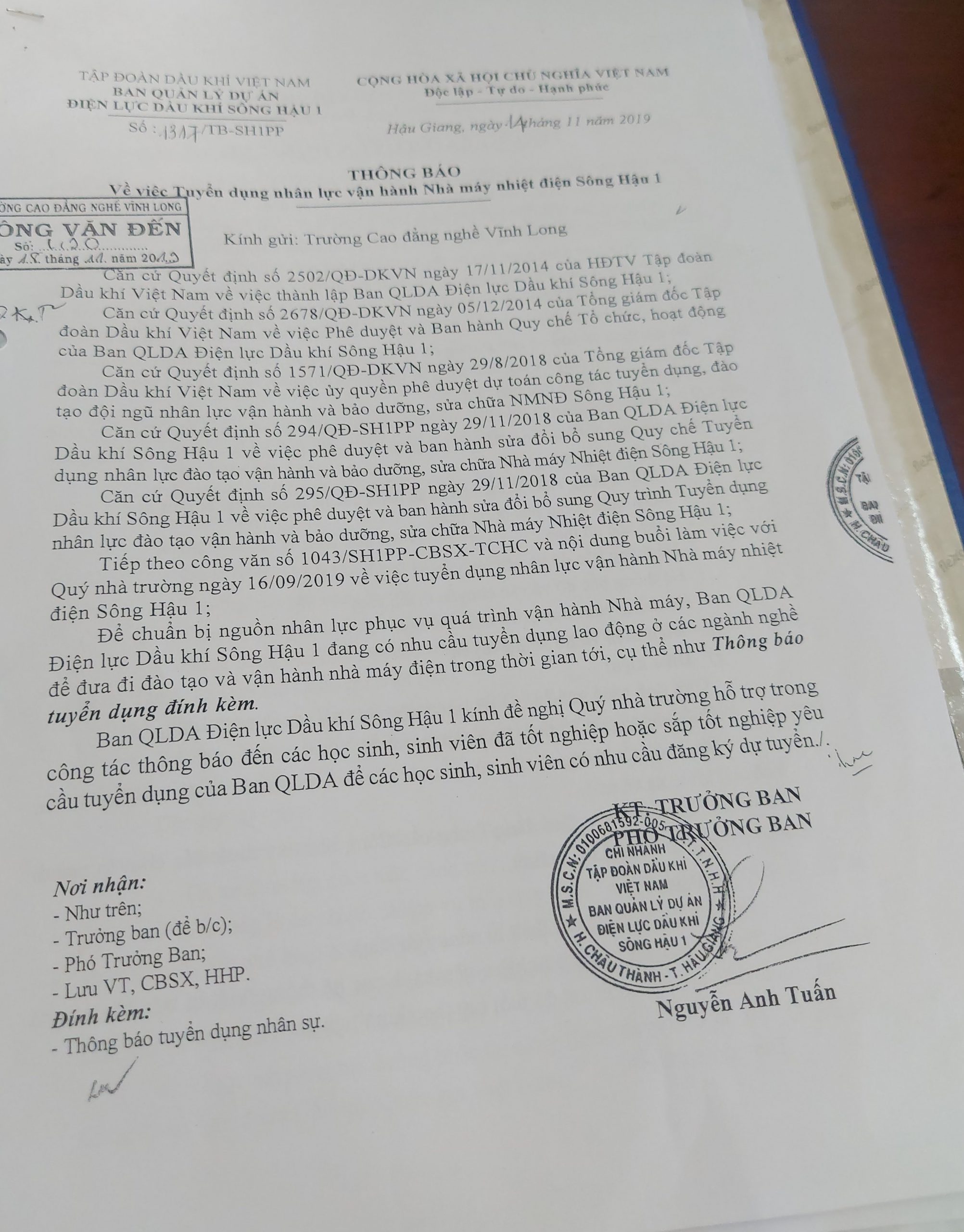 Thông tin việc làmBan quản lý dự án Dầu khí Sông Hậu 1 tuyển dụng nhân lực vận hành Nhà máy nhiệt điện Sông Hậu 1 Đăng vào 14/11/201922/05/2021 bởi Administrator 14 Th11 Administrator Hưởng ứng Chương trình “Toàn thể cán bộ, công chức, viên chức, HS-SV trường Cao đẳng nghề Vĩnh Long chung tay bảo vệ môi trường Xanh-Sạch- Đẹp” năm học 2019 Cty cổ phần thủy sản Minh Phú – Hậu Giang tuyển dụng lao động