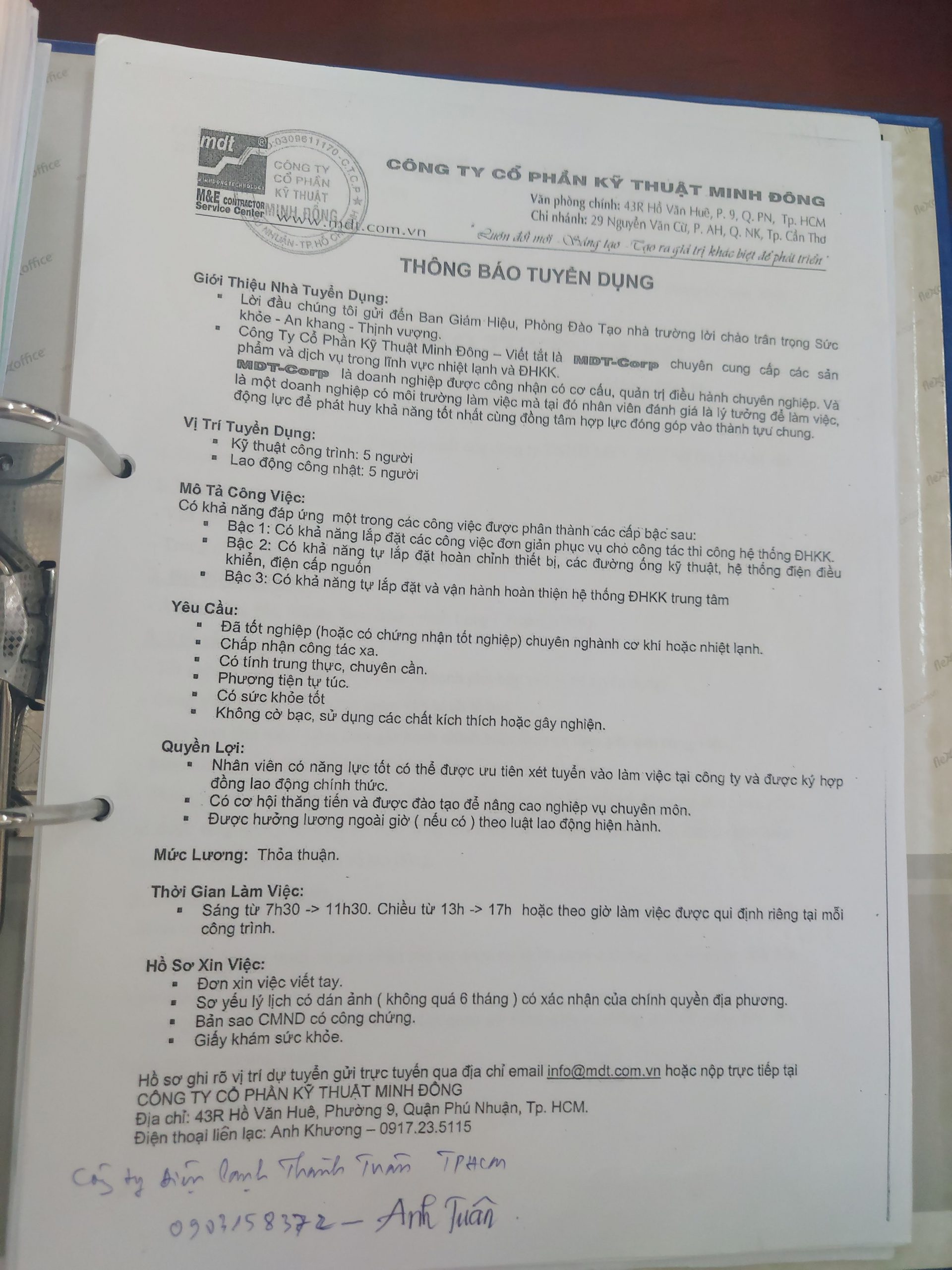 Thông tin việc làmCông ty cổ phần kỹ thuật Minh Đông thông báo tuyển dụng Đăng vào 22/05/201922/05/2021 bởi Administrator 22 Th5 Administrator Công ty TNHH MTV DV Viễn thông Phương Nam (PCN TELECOM) Công ty bê tông Vĩnh Long thông tin tuyển dung lao động