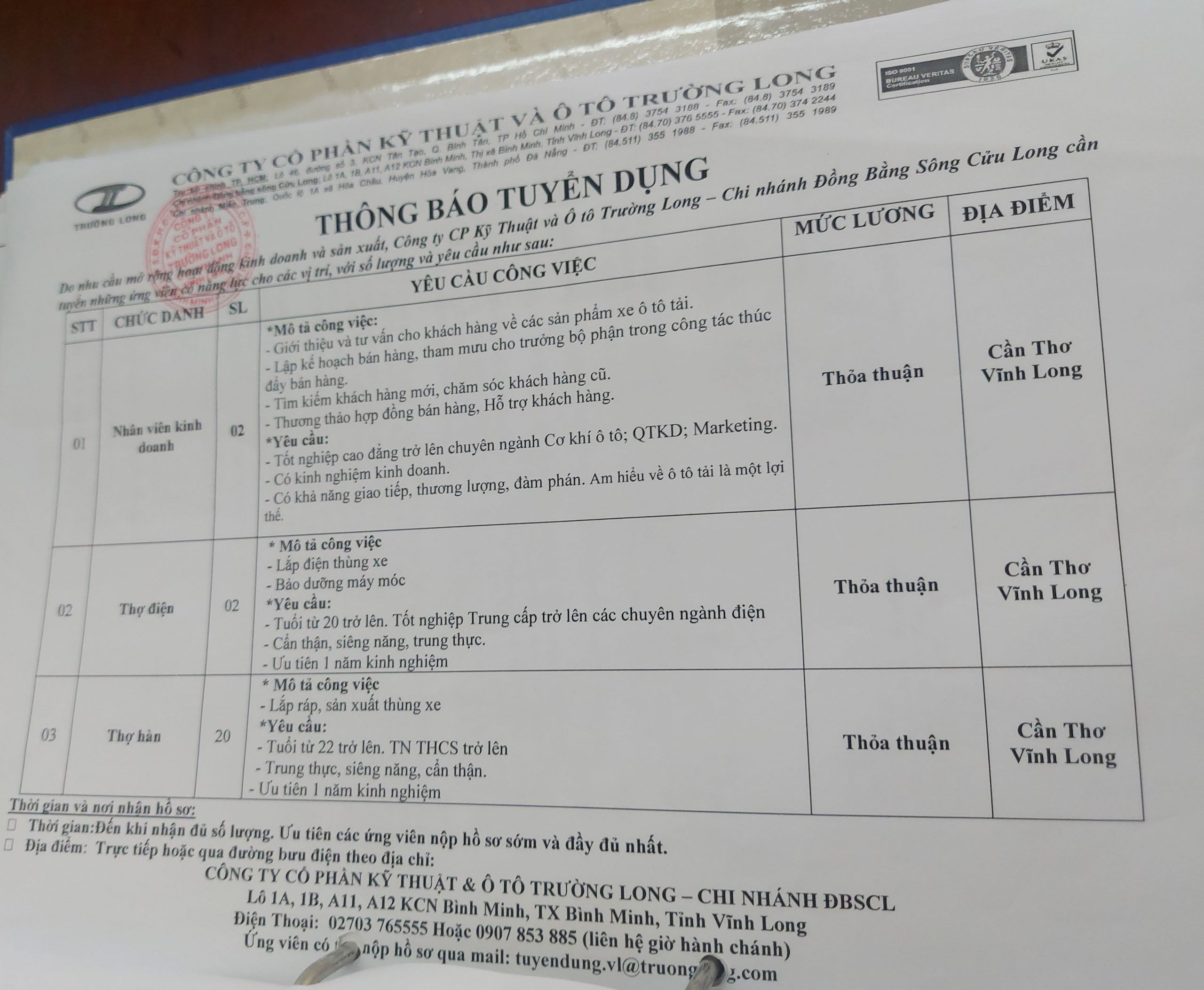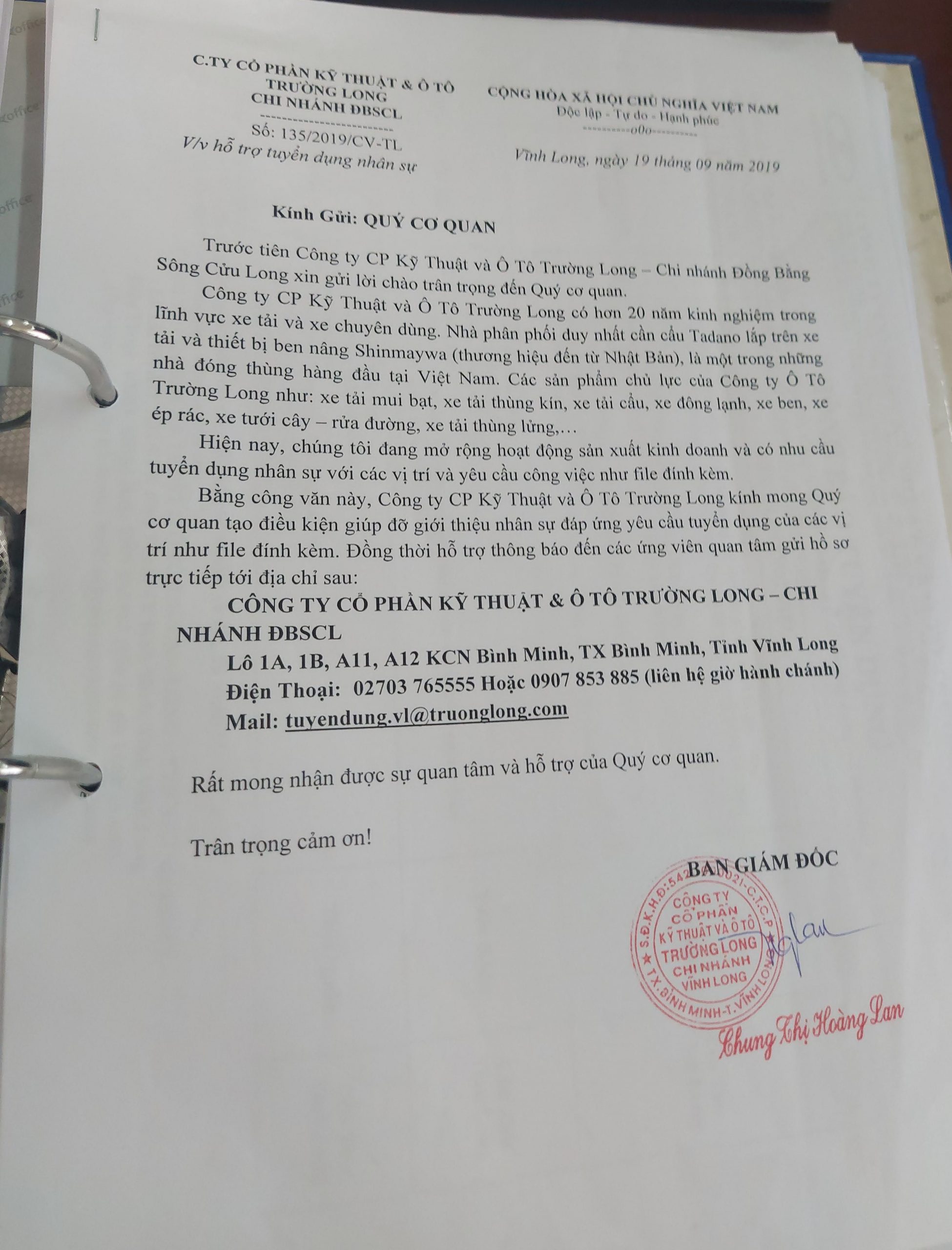 Thông tin việc làmCông ty cổ phần kỹ thuật & ô tô Trường Long – Chi nhánh ĐBSCL tuyển dụng nhân sự Đăng vào 19/09/201922/05/2021 bởi Administrator 19 Th9 Administrator Phát động Chương trình “Toàn thể cán bộ, công chức, viên chức, HS-SV trường Cao đẳng nghề Vĩnh Long chung tay bảo vệ môi trường Xanh-Sạch- Đẹp” năm học 2019 Tổ chức giải thi đấu bóng chuyền chào mừng 37 năm ngày nhà giáo Việt Nam (20/11/1982 – 20/11/2019)
