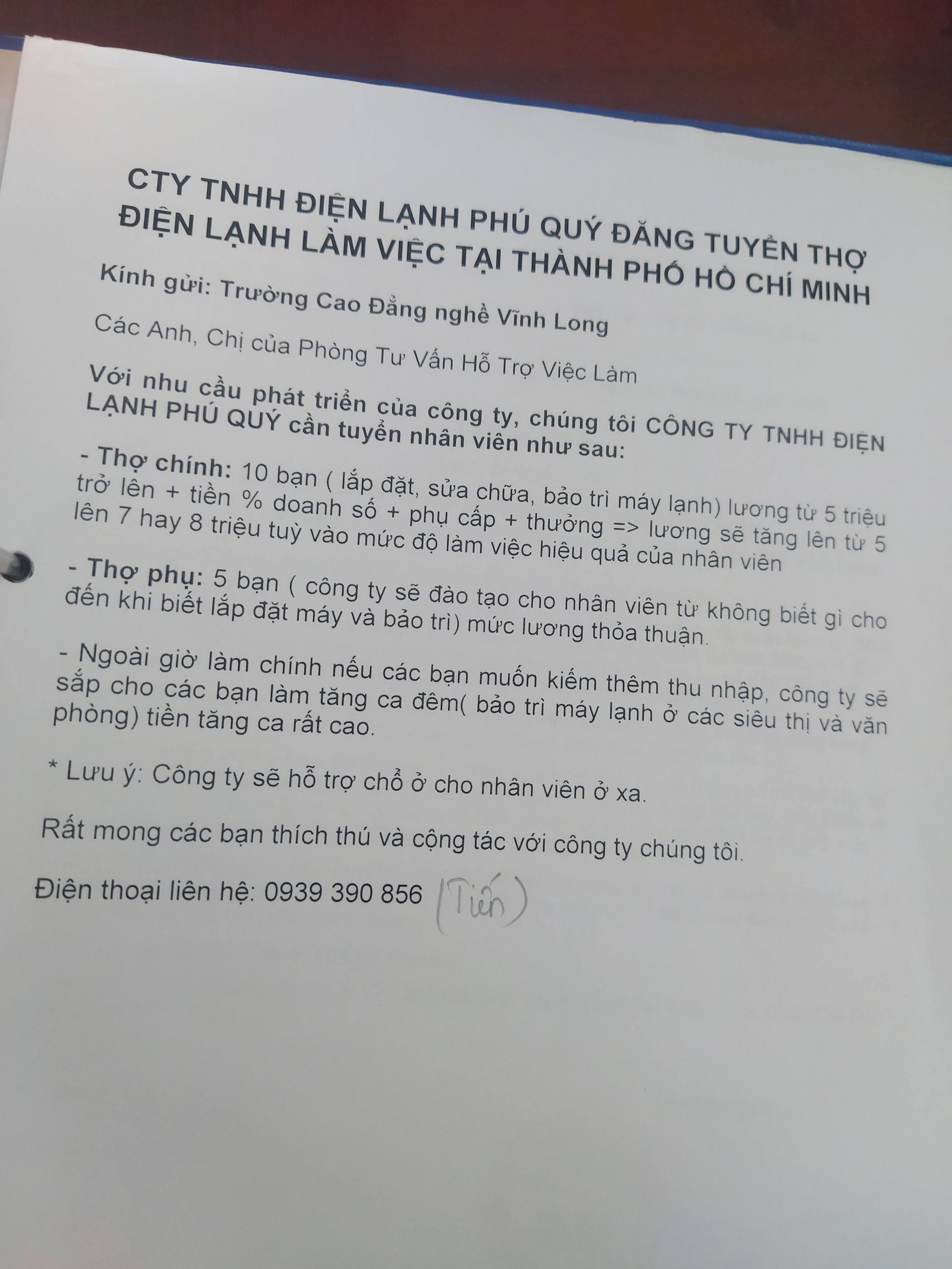 Thông tin việc làmCông ty TNHH Điện lạnh Phú quý đăng tuyển thợ điện lạnh làm việc tại TPHCM Đăng vào 22/12/201822/05/2021 bởi Administrator 22 Th12 Administrator Tham dự Hội thao Sinh viên, họp mặt truyền thống 9/1 và tuyên dương “Sinh viên 5 tốt” tỉnh Vĩnh Long năm 2019 Bảng công khai học phí & lệ phí