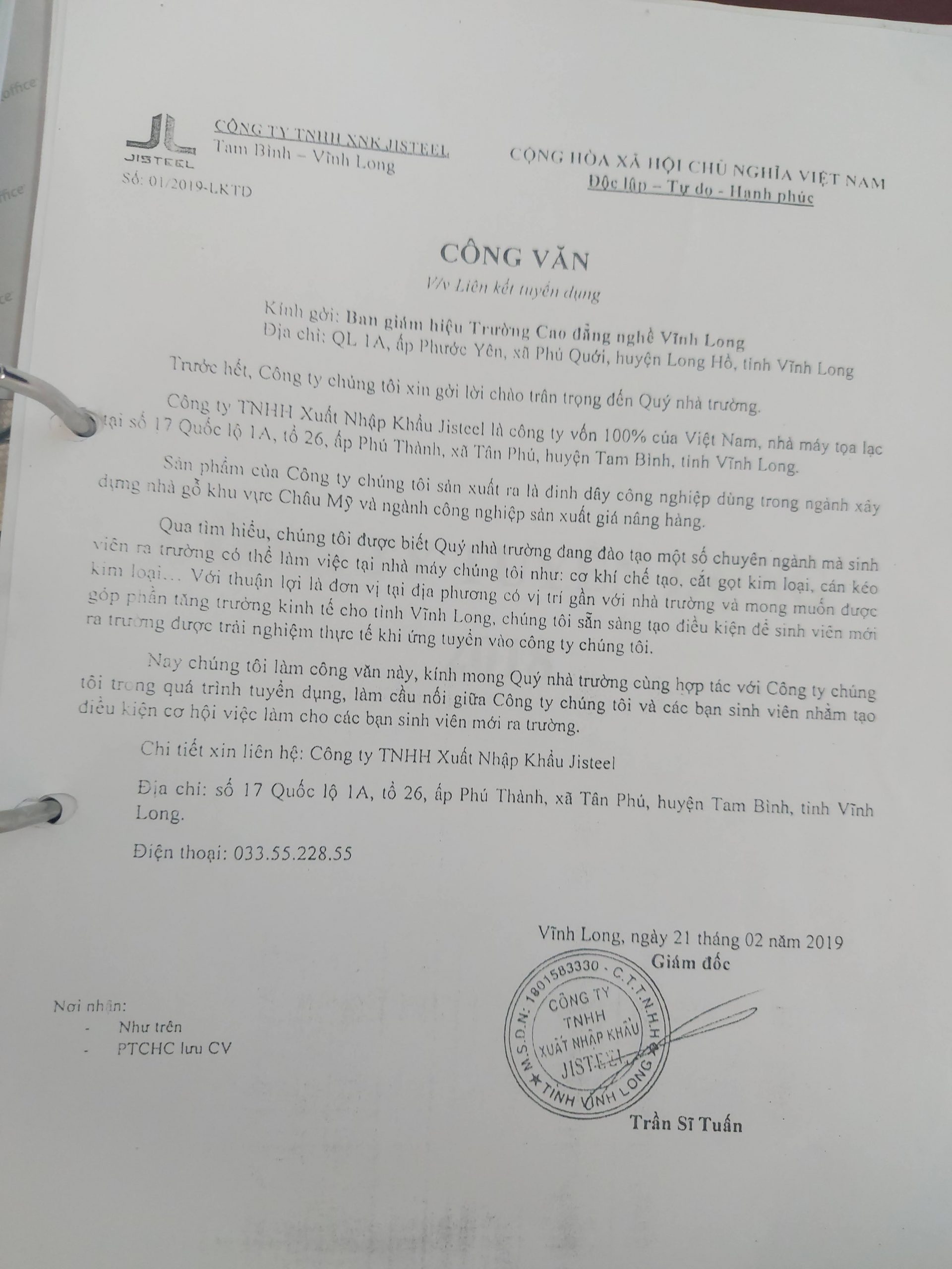 Thông tin việc làmCông ty TNHH XNK JISteel liên kết tuyển dụng Đăng vào 21/02/201922/05/2021 bởi Administrator 21 Th2 Administrator Tổ chức Giải thi đấu bóng đá mi ni HS-SV lần thứ I chào mừng 88 năm ngày thành lập Đoàn TNCS Hồ Chí Minh (26/3/1931 – 26/3/2019) hướng đến kỷ niệm kỷ niệm 44 năm ngày giải phóng miền nam, thống nhất đất nước (30/4/1975 – 30/4/2019) và 133 năm ngày Quốc tế lao động 1/5 Công ty TNHH MTV TMDV Tin học Trường Lâm thông báo tuyển dụng