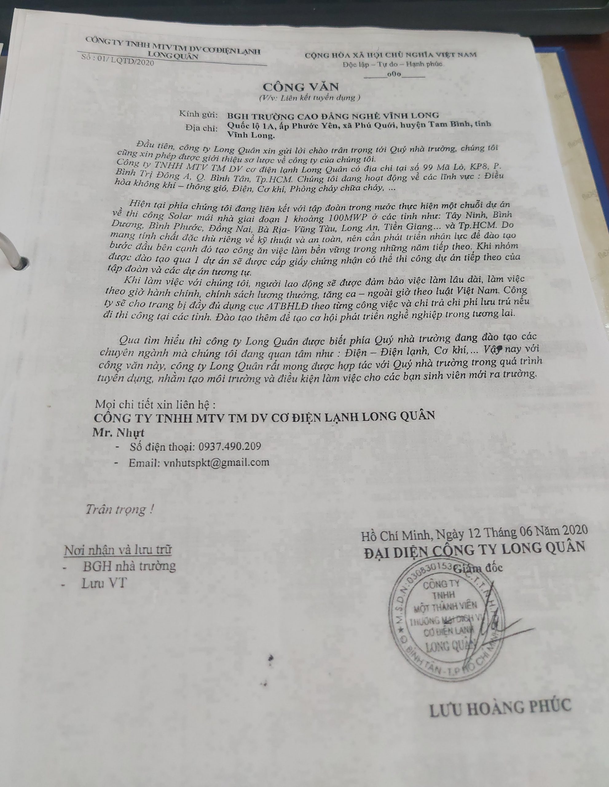 Cty TNHH MTV TM DV Cơ điện lạnh Long Quân liên kết tuyển dụng