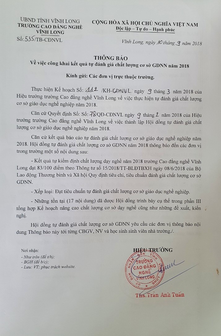 THÔNG BÁO CÔNG KHAI KẾT QUẢ TỰ ĐÁNH GIÁ CHẤT LƯỢNG CƠ SỞ GDNN NĂM 2018