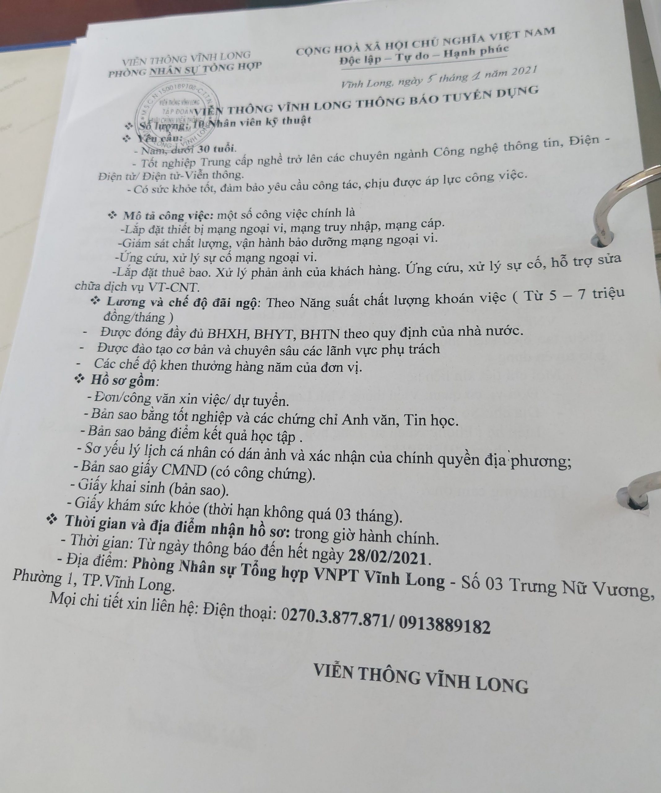 Viễn thông Vĩnh Long thông báo tuyển dụng 10 nhân viên kỹ thuật
